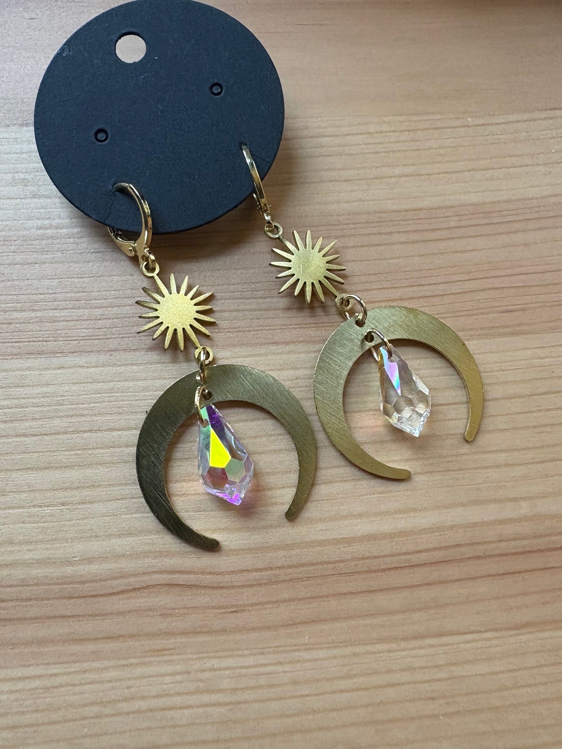 Elevate your style with our Classic Crescent Moon Sun Crystal Earrings! These stunning earrings feature an 18 karat gold post and delicate dangle design that will add a touch of elegance to any outfit. Perfect for any occasion, these earrings will make you feel confident and glamorous with every wear.