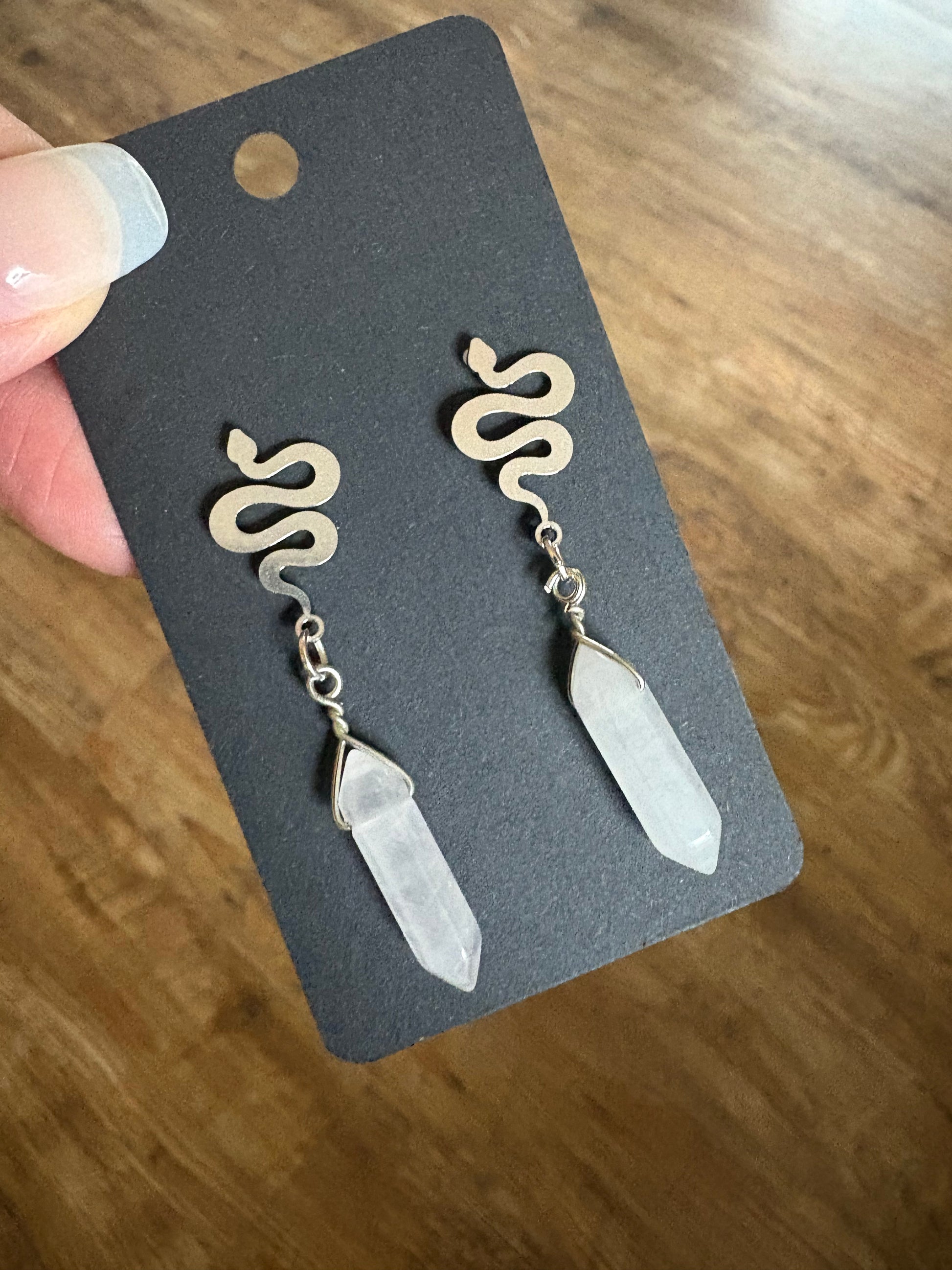 Unleash your bold, daring side with our Crystal Snakes earrings! Made with silver snake earrings posts and 1 inch double terminated crystals, these earrings add a touch of mystery and adventure to any outfit. Get ready to slither into style with these daring and unique earrings.