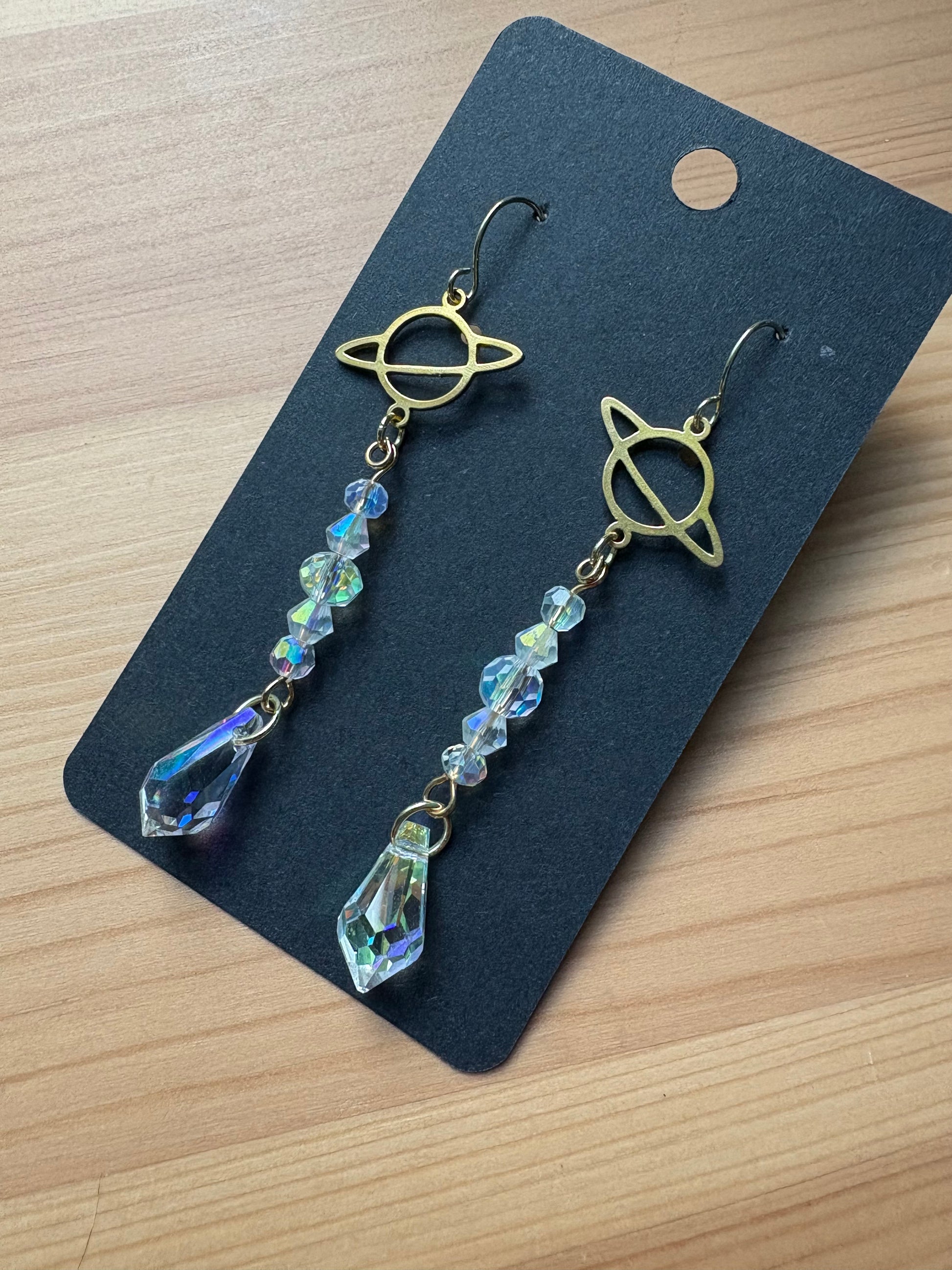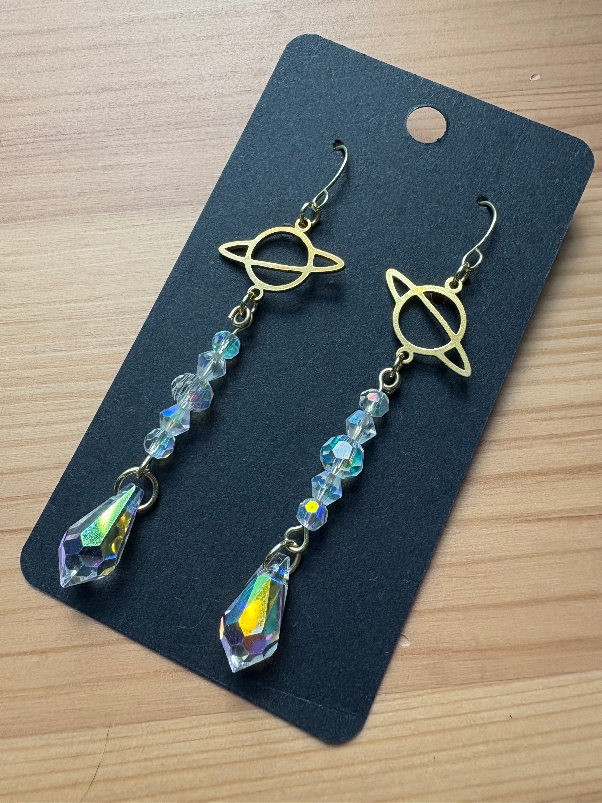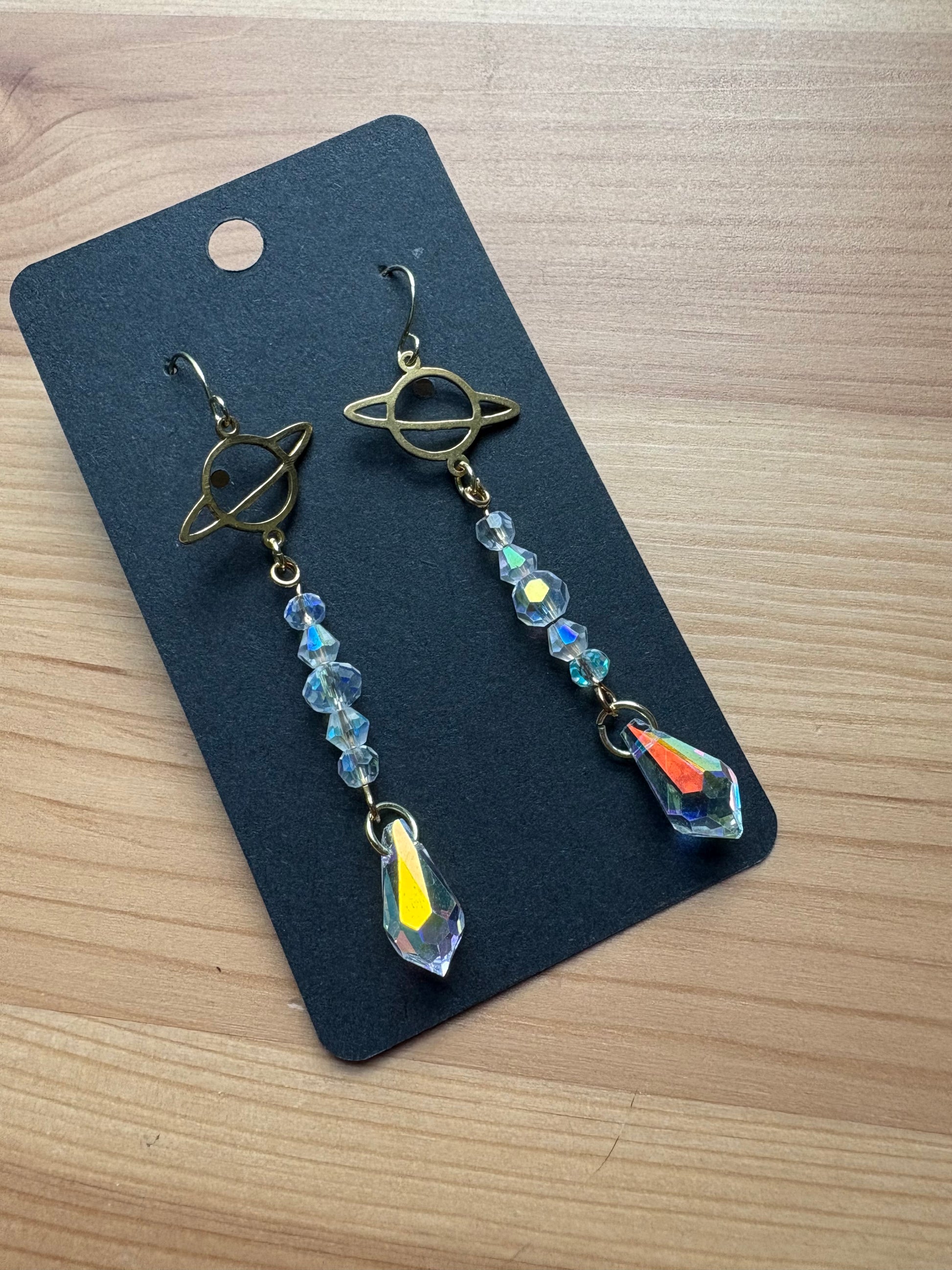 Add some sparkle to your look with our Saturn-inspired dangling earrings. Each earring features colorful crystals that shimmer in the sun, adding a touch of gold to your style. With these earrings, you'll feel out of this world!