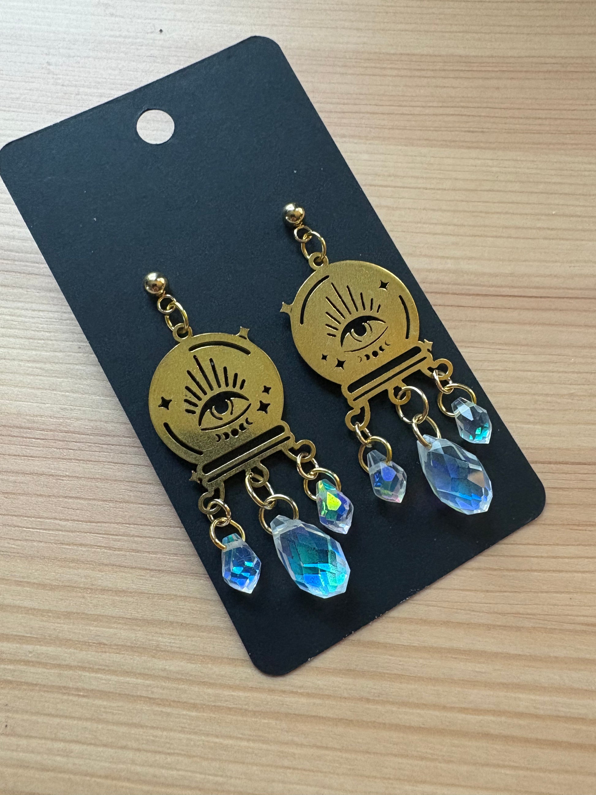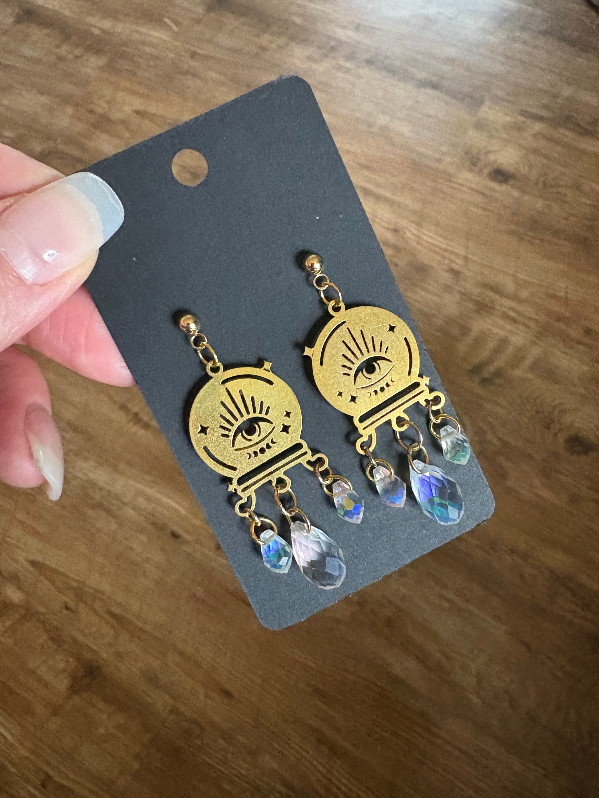 "See your future in style with our Seeing Crystal Ball! Featuring a charming crystal ball with mini sun crystals, these earrings will add a touch of whimsy to any outfit. Made with 18 karat gold earring posts for a luxurious touch. Embrace your inner fortune teller and snag a pair today!"