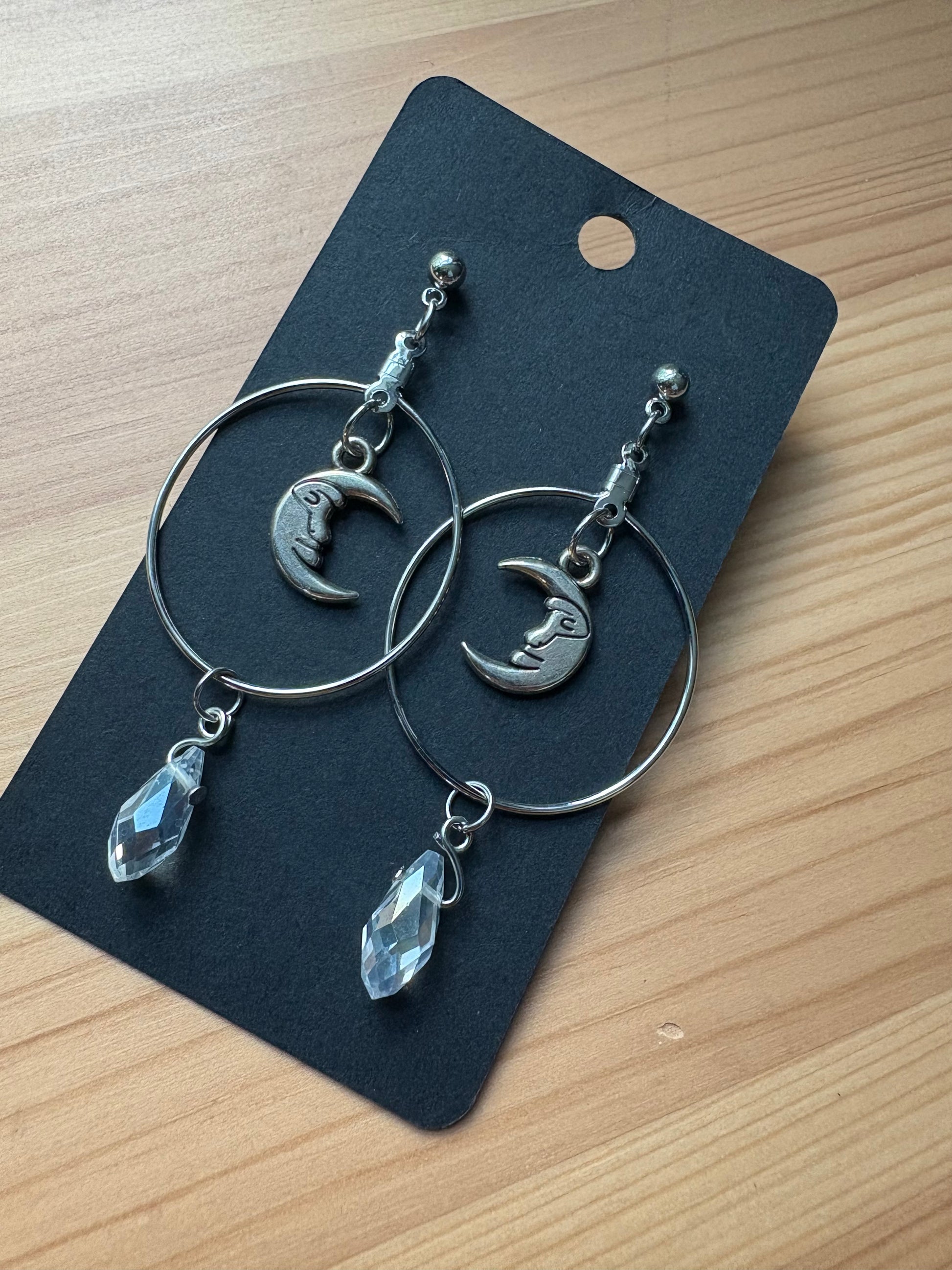 Unleash your celestial style with these playful earrings! These silver crescent moon earrings showcase a stunning sun crystal, perfect for adding a touch of whimsy to any outfit.