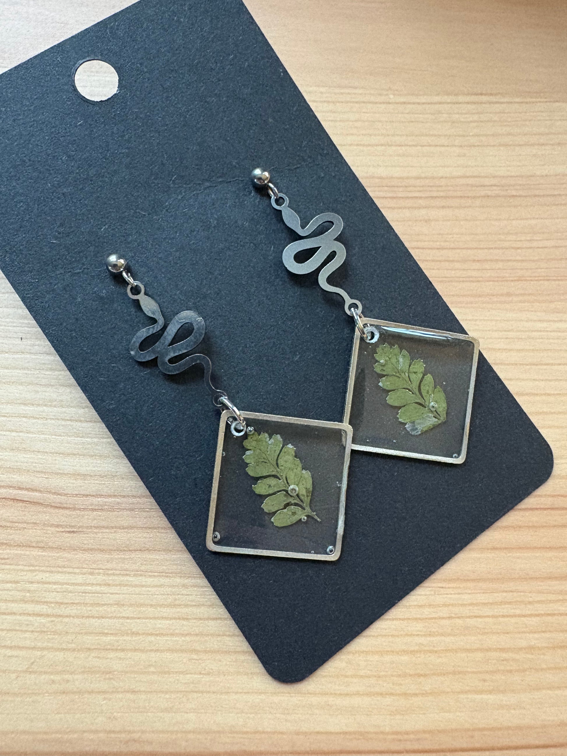Let the Spell Fern earrings bring a touch of nature with you wherever you go. These lightweight, stainless steel earrings feature a crisp green fern encased in clear resin, making them perfect for sensitive ears. The silver hardware adds a touch of elegance to these nature-inspired earrings. One of a kind pair!