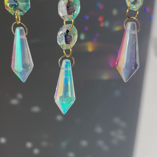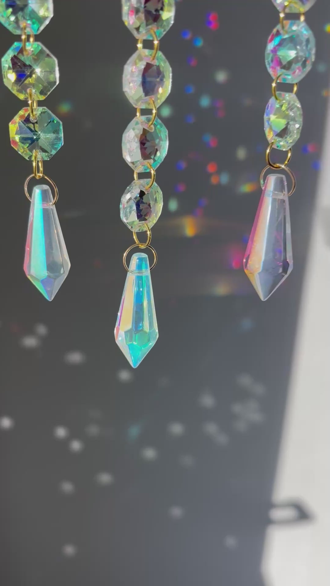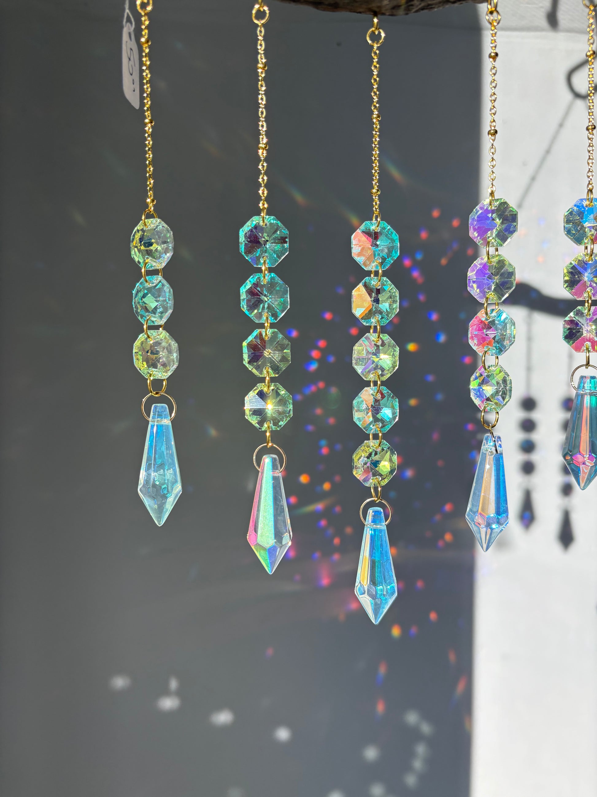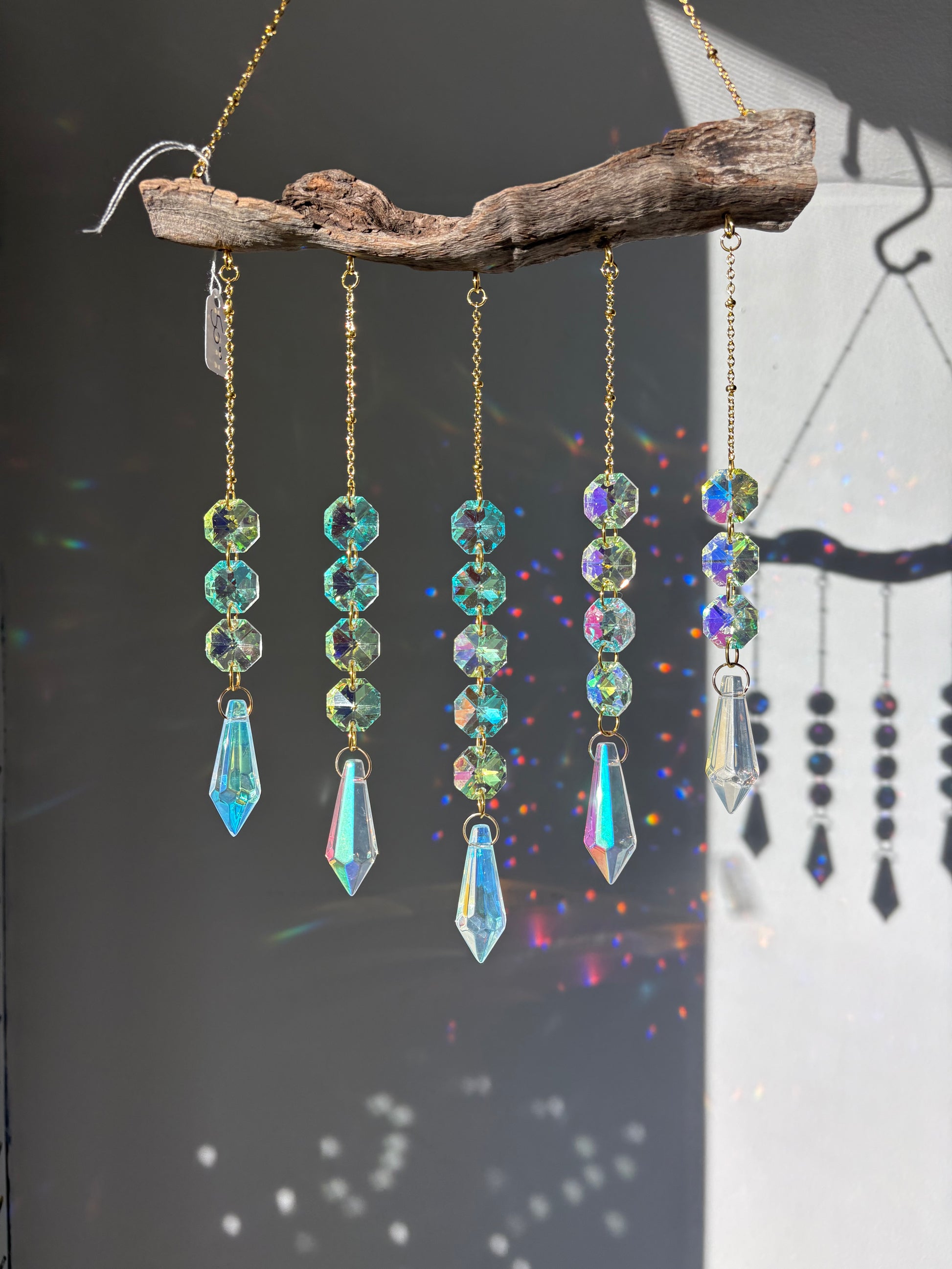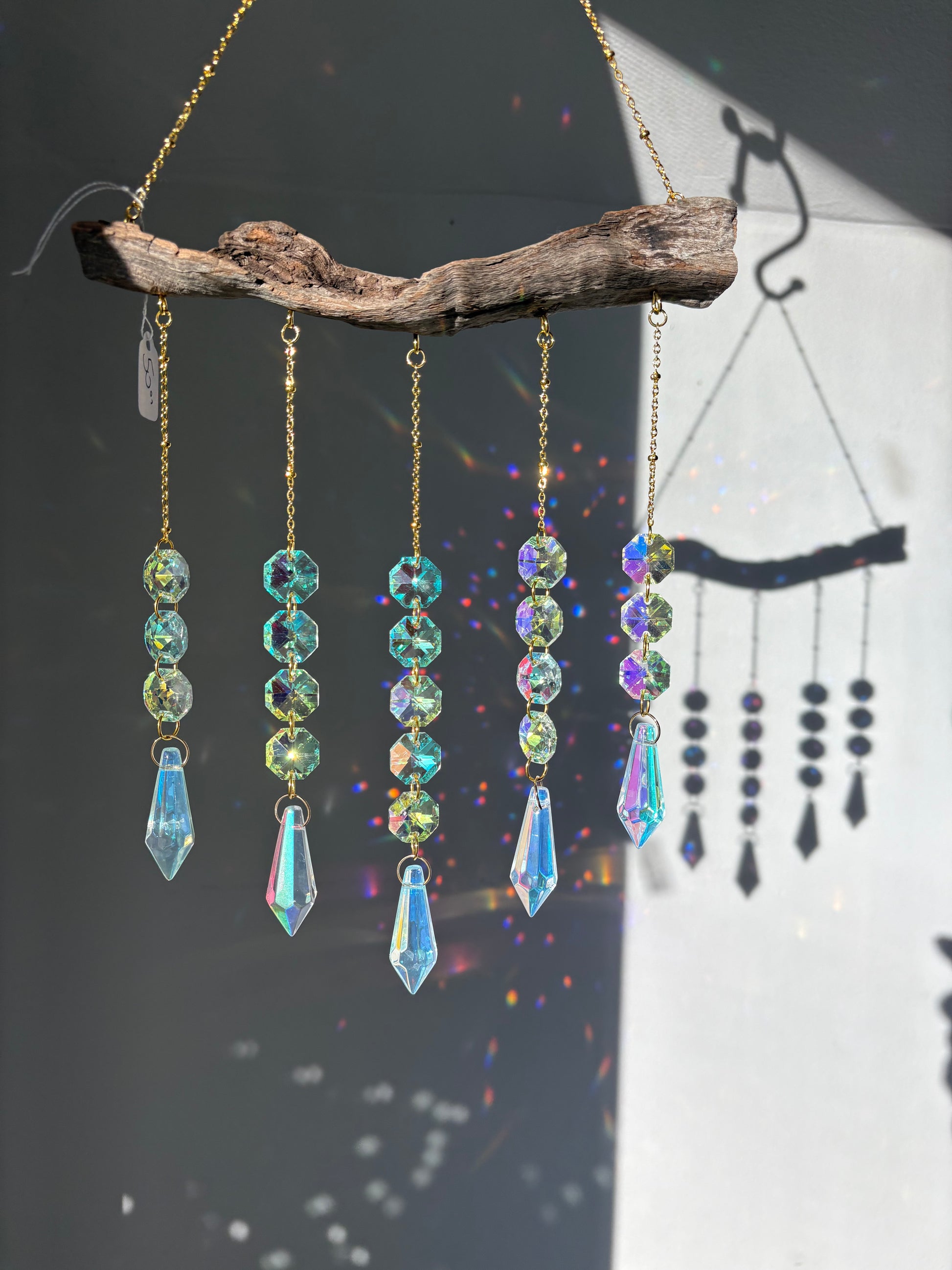 Iridescent sun crystals hanging from beautifully twisted driftwood 14” long